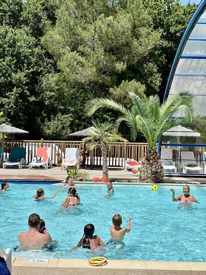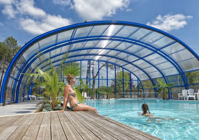 Afin de pouvoir se baigner en tout temps et malgré les caprices de la météo, la piscine peut se couvrir. Initialement découverte, les jours où le soleil se cache, l'équipe du camping Landes Bleues pourra rapidement couvrir le bassin aquatique.